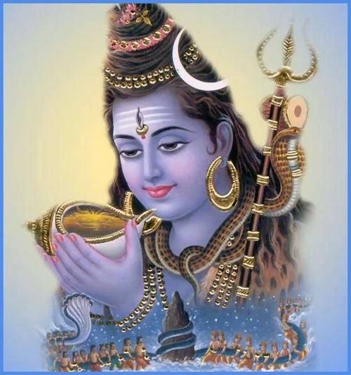 Para descobrir o néctar da imortalidade, devas e asuras resolveram se juntar para bater o Oceano de leite. Pegaram uma montanha colocaram no meio do oceano. Amarraram uma cobra no meio e cada um deles puxou de um lado fazendo a cobra como corda para que, assim, a montanha batesse o oceano de leite. Começaram a bater e coisas lindas e maravilhosas surgiram desse oceano de leite. As coisas que foram surgindo e foram sendo divididas entre eles. Porém antes de surgirem essas coisas lindas, surgiu um veneno. O veneno (halahala) começou a se espalhar pela superfície do oceano e a matar todos os seres do oceano. Devas e asuras assustados, chamaram Shiva para resolver a situação. Ele resolveu tomar o veneno inteiro. Após ele tomar, Uma, apertou o seu pescoço que começou a ficar a azul (Nilakantha). Então eles continuaram a bater e bater.